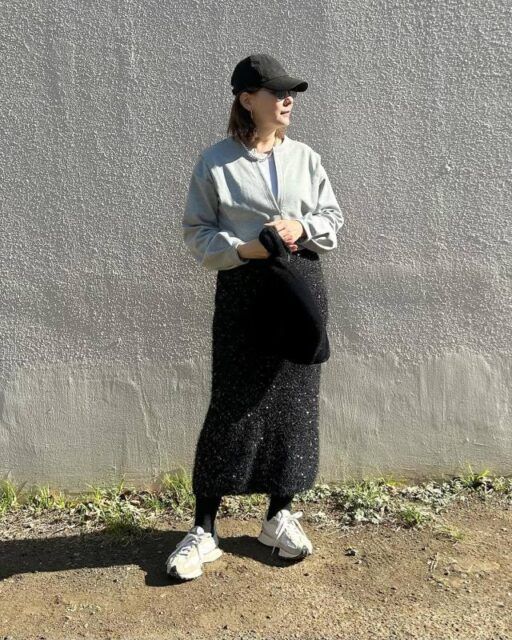 ベーシックな「黒のロングタイトスカート」は大人がスニーカーを履くときにうってつけ。Iラインのスカートに大人っぽさがあるので、スニーカーコーデがシックな雰囲気にアップデート。このとき厚手の黒タイツを仕込むと、防寒対策になる上に冬の服としっくり馴染みます。