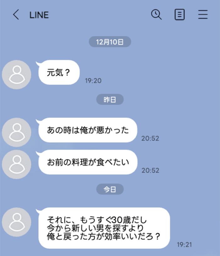 「それに、もうすぐ30歳だし、今から新しい男を探すより俺と戻った方が効率いいだろ?」