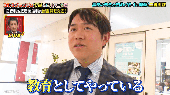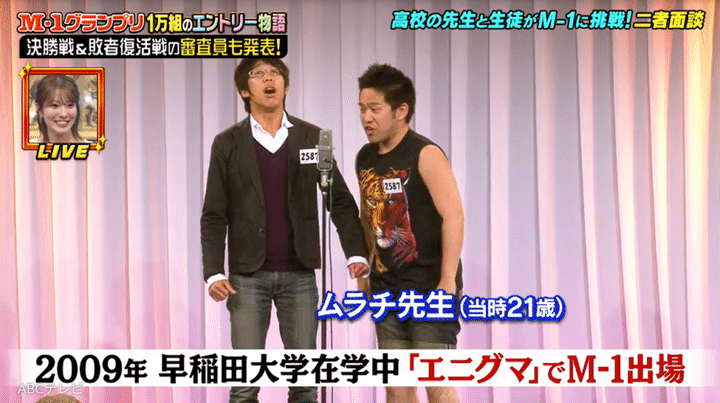 実はムラチ先生は、かつて早稲田大学の漫才サークルに所属。在学中にお笑いコンビ「エニグマ」として『M-1グランプリ』に出場し、2年連続2回戦進出という実績があった。しかも当時の彼の相方は、現在ピン芸人として活躍する、ひょっこりはんだった! こうした過去を活かして現在ムラチ先生は、漫才を通して生徒たちの表現力や挑戦する力を育てている。