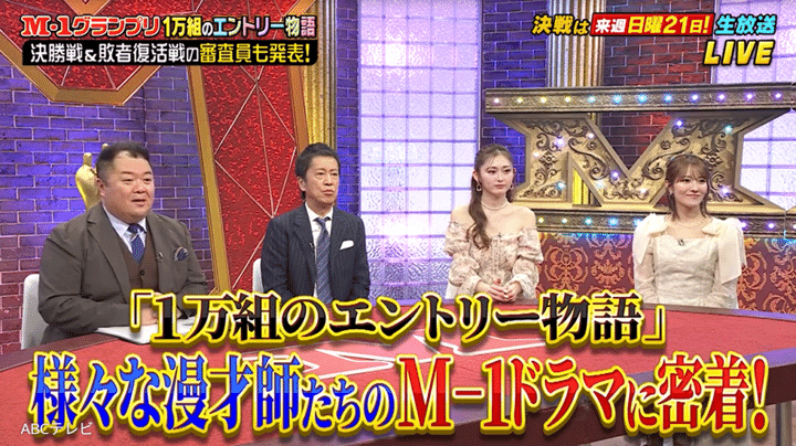 なお、二者面談の密着映像は、12月14日に生放送された特番『M-1グランプリ 俺たちだって面白い!1万組のエントリー物語』(ABCテレビ)で公開された。ちなみに、『M-1グランプリ2025』の決勝は12月21日よる6時30分から、同大会の敗者復活戦は同日午後3時から、ABCテレビ・テレビ朝日系列全国ネットで生放送される。