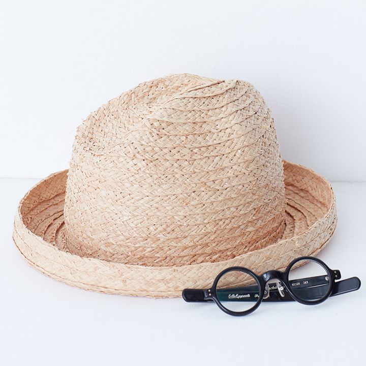「マウンテンリサーチ」の麦わら帽子は夏の必需品。汗止めのスウェットバンドは取り外し式で洗濯可能。気持ちよく使えます。通常はコンタクトレンズですが、映画の字幕をはっきり読みたいとき用の度つき眼鏡をかけています。