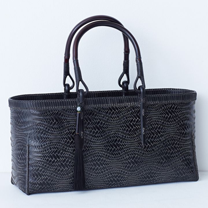 九州を旅行中、大分の「竹工房オンセ」で高江雅人さんのかごバッグの美しさに一目惚れ。金縛りにあったかのように動けなくなり、全部欲しい! となりましたが、その場で1つ購入し、漆塗りの黒は冬用にオーダーしたもの。表面が滑らかなので服にひっかかることもなく、持ち手が1本の竹なので手にも優しい。内布は泥染めの大島紬で、着物にも洋服にも合う。