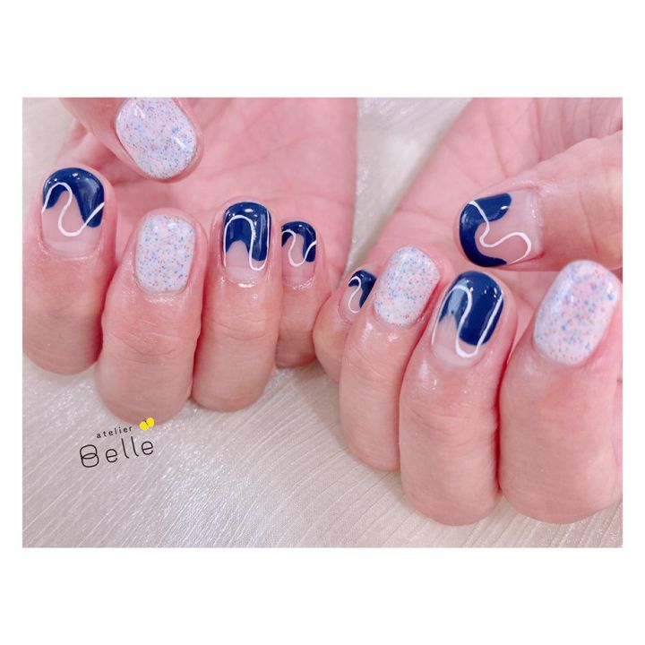 今回は、深みのあるネイビーカラーに、ホワイトベースの砂ジェルを合わせた上品なネイルデザインをご紹介いたします。