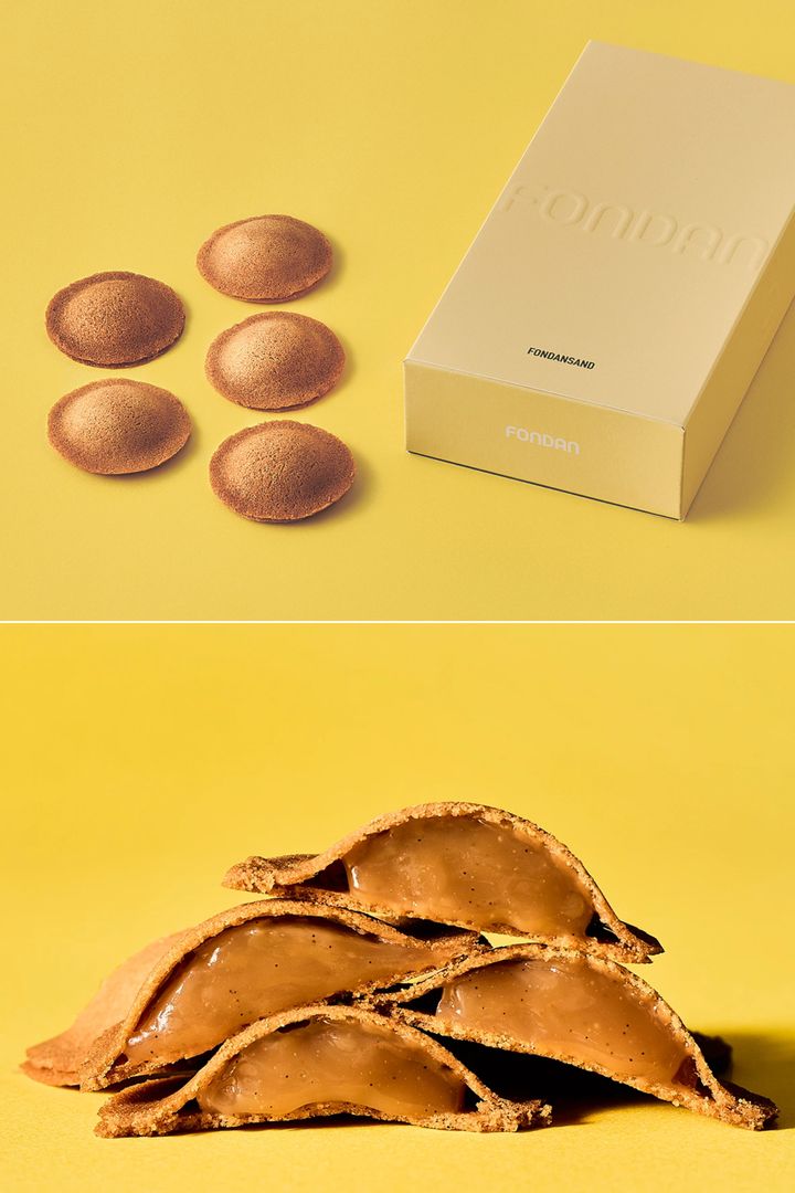「フォンダンサンド」はカリッとした食感のラングドシャで、自家製の“生バター”を溶かし込んだなめらかな生キャラメルをサンド。長く続く豊かなコクの余韻を、コーヒーや紅茶と一緒に味わって。