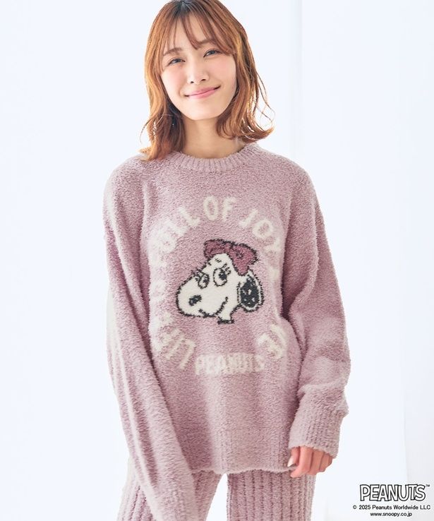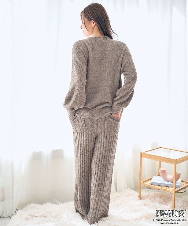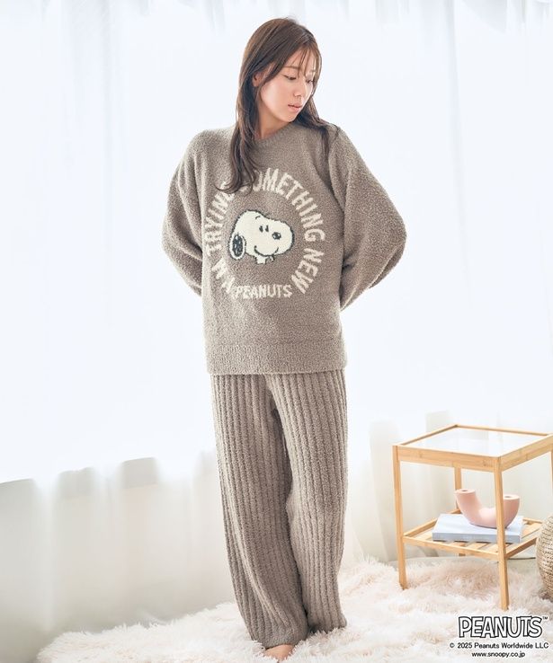 「PEANUTS スヌーピー フェイス ニット 長袖 上下セット」(各8580円)は、スヌーピー、ウッドストック、ベルをモチーフにした3つのカラー展開のルームウェア。マシュマロのようなふんわりとした触り心地と、脚長効果抜群のリブ編みボトムスに、「PEANUTS」の仲間たちのデザインが映える。