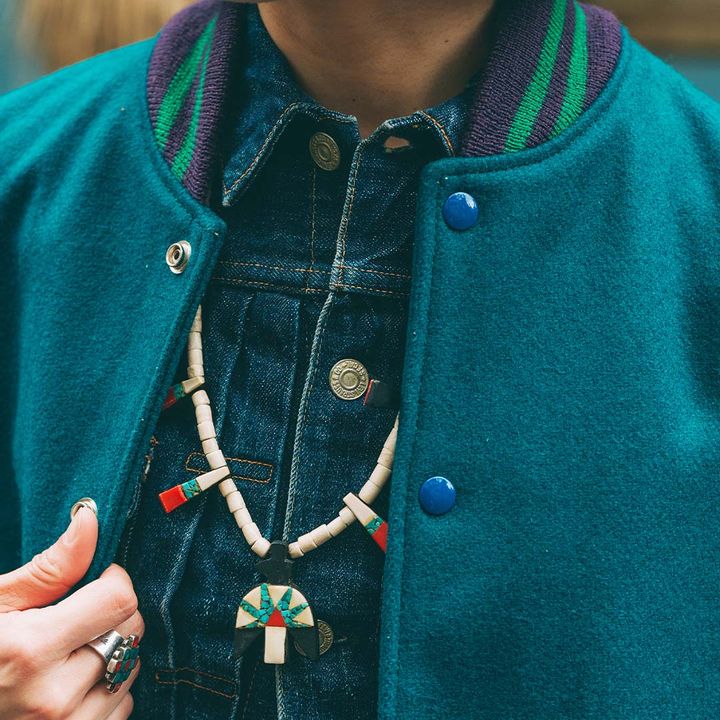 首元にはキャッチーなインディアンジュエリーのネックレスをオン。ジャケットレイヤードに奥行き出してくれる。