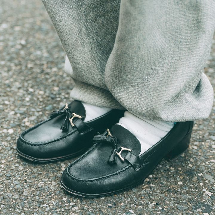 足元は『ニードルス』と『グイド』のヒールローファーに決まり! スウェットボトムスをきれいめに一気に格上げ。