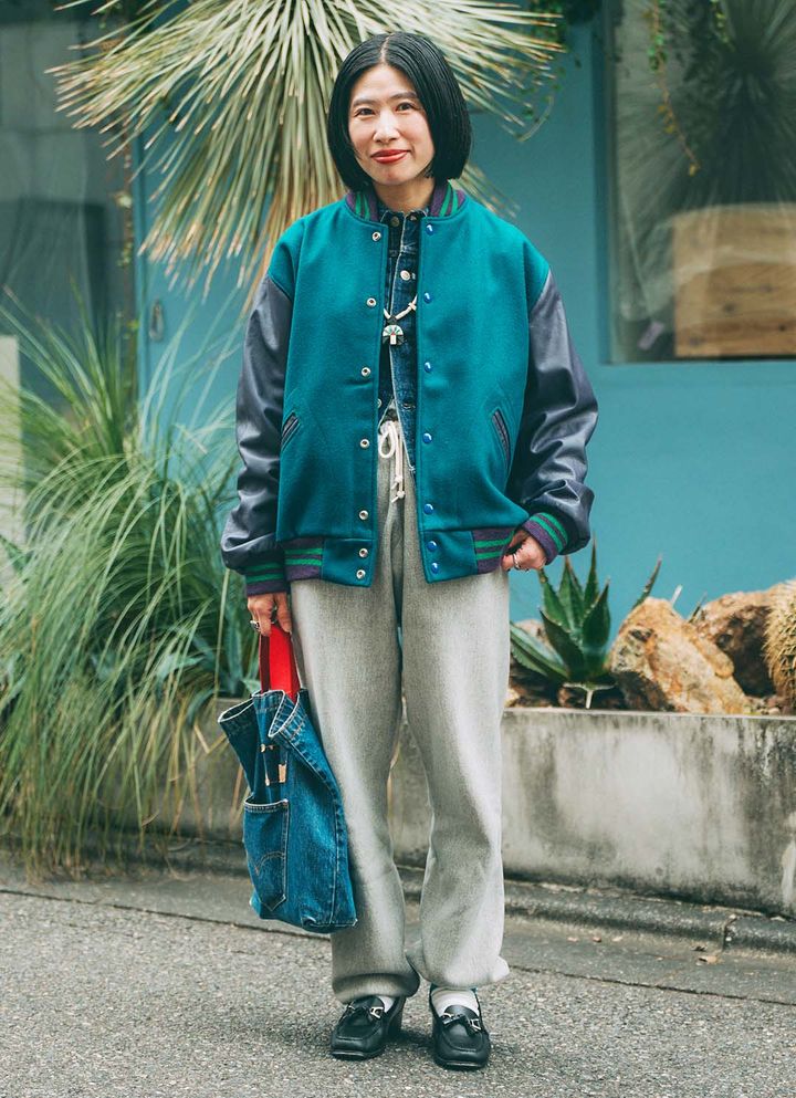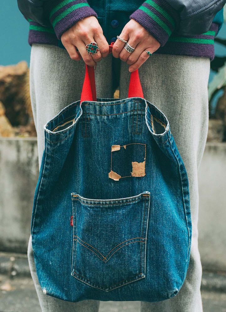 バッグはジャケットをデニムをシェアして統一感アップ! レッドのハンドルが好アクセントのユニークなアイテム。