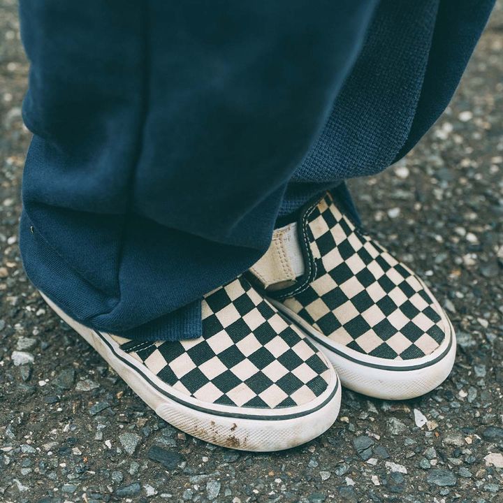 『ヴァンズ』のチェッカー柄スリッポンで、スパイスをひとふり。足元から始まるおしゃれが、親子コーデ全体を楽しく演出。