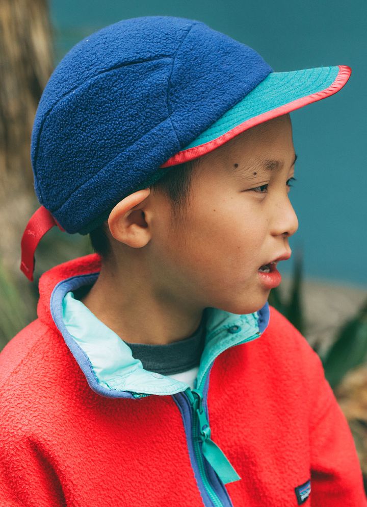 『パタゴニア』のフリースハットは、ポップな3色使いがポイント。トップスとセットにして、元気いっぱいな冬コーデの完成!