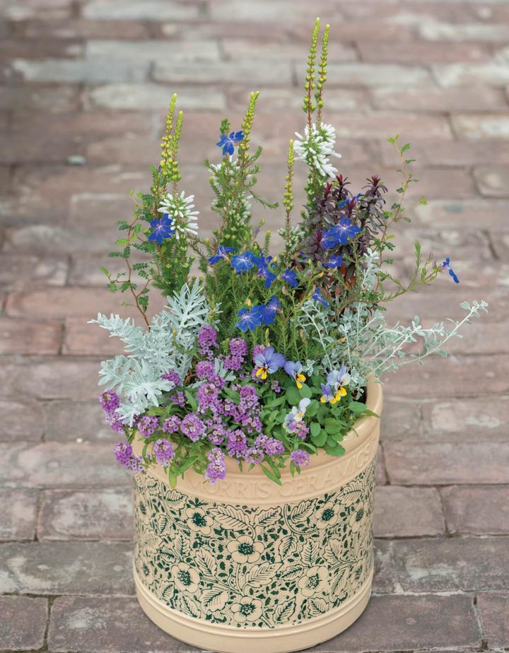 フローラル柄がおしゃれな「ウィリアムモリス」の鉢。鉢の雰囲気に合わせて、エリカ ‘ホワイトデライト’やブルーのハツコイソウで高さを出し、シルバー系のリーフと銅葉をミックス。手前にはビオラとボリュームたっぷりのスイートアリッサムを植えました。寒さには耐えられる植物ばかりですが、厳冬期の夜間などは屋内に取り込むほうが安全です。
