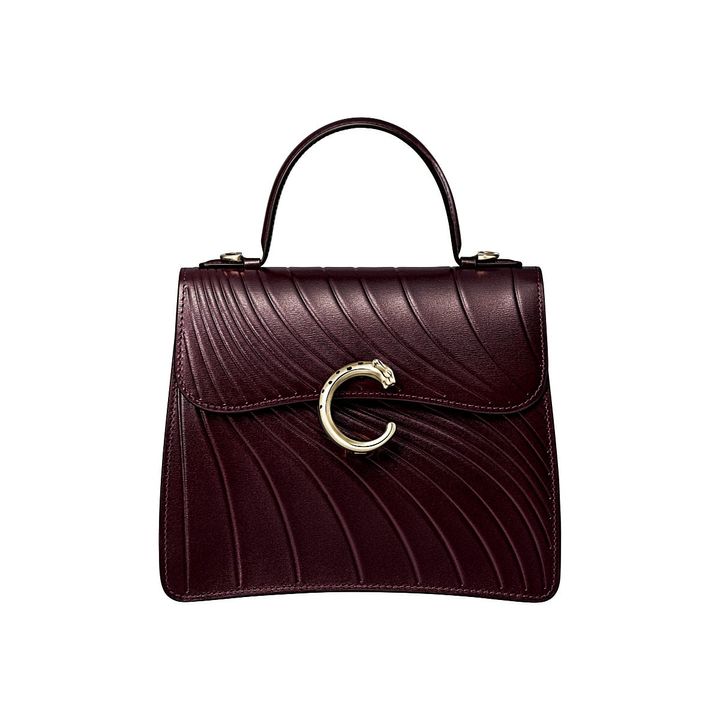 パンテールのクラスプと、シグネチャーモチーフの型押しレザーが、バーガンディを上品に格上げ。
