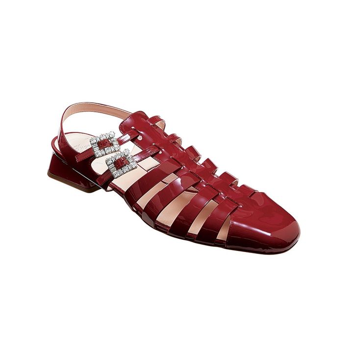 エナメルの光沢と煌めくダブルバックルが、グルカサンダルをエレガントに昇華。フラットなので、快適な履き心地。靴“トレ ヴィヴィエ”[H2.5]¥212,300(ロジェ ヴィヴィエ/ロジェ・ヴィヴィエ・ジャパン)