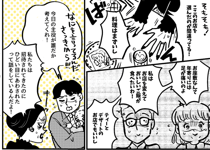 お義母さんは騒ぎつづけます。「そもそもお店のチョイスが悪い」「ティーとデザートのお店に行きましょう」「招待されたのにひどい目にあったわ」なんて……お義母さんの愚痴はとまりません。さすがの旦那も「今日の主役が誰だか考えてくれ!」とお義母さんに言い返していました。
