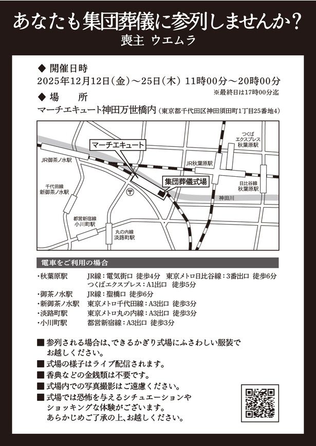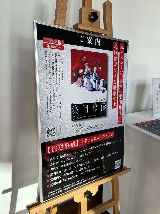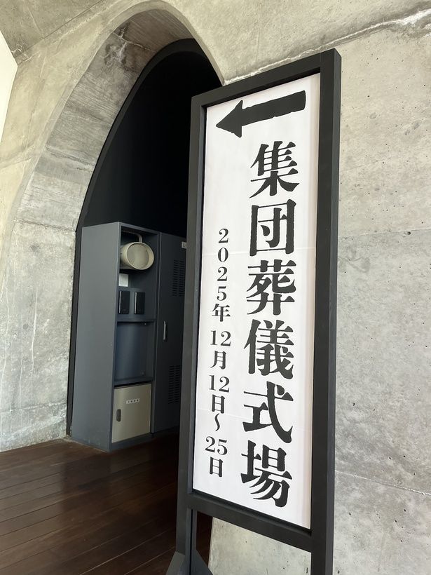 実は、そんな『集団葬儀』の世界を体験できる展示がマーチエキュート神田万世橋で2025年12月12日(金)から25日(木)までの間、期間限定で開催されている。本展示は主人公が体験する“不穏な葬儀会場”を現実空間で再現したもの。実際にその葬儀に参列してみた。