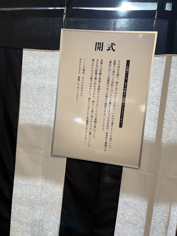 さらに会場には、祭壇も供えられている。供花の香りと、どこからともなく流れる読経が五感をじわじわ侵食し、思わず息を呑む。そして、小説同様、ここでは参列者が特殊な方法でお焼香をすることになる。真っ黒な遺影の前に立つと、光の反射で自分の顔が映った。映ったのは顔だけではない気がして、思わず目を逸らしかける。そっと故人に手を合わせながら思う。この葬儀は誰のためのものなのだろうか、と。ふと、自分だっていつあちら側に行くか分からないのだということに気づき、身の毛がよだつ思いがした。