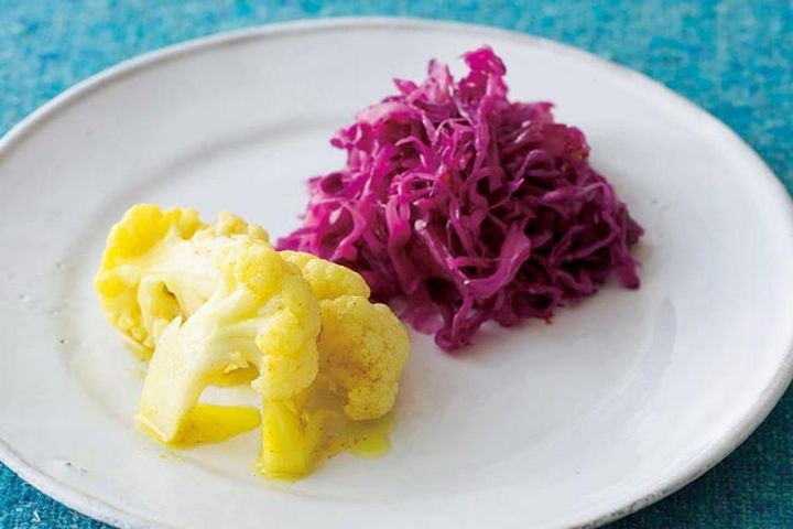 ②カリフラワーを小房に分ける。塩と酢を加えた熱湯で好みのかたさにゆで、ざるに上げる。