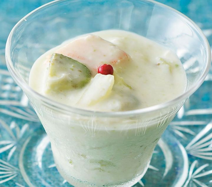 ③①を湯せんにかけてとかし、マヨネーズを加えて混ぜ、ヨーグルト、Aを加えて混ぜ、味をととのえる。ボウルの底を氷水で冷やし、とろみをつける。