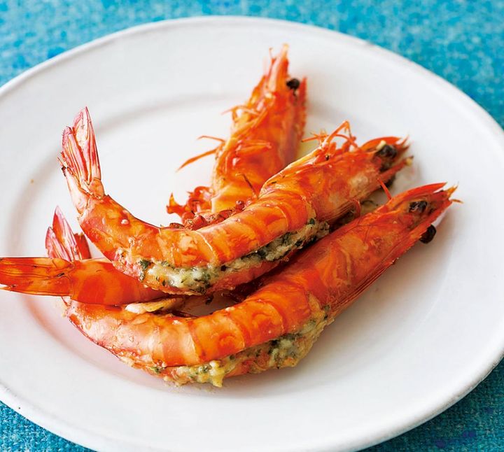 ①えびは背に深く切り込みを入れて背わたを取り、塩、こしょう、ワインを振る。