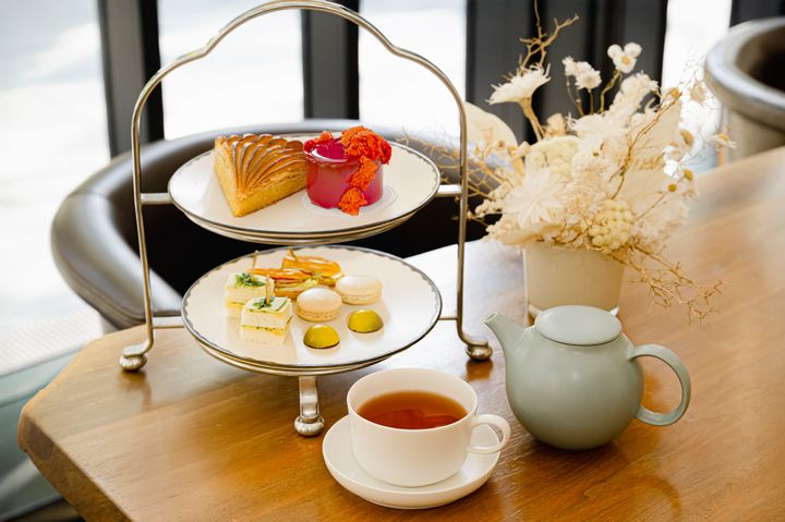 主役となる「ガレット デ ロワ・クラシック」は、バターがふわりと香る折り込みパイ生地に、アーモンドクリームを詰めた王道のスタイル。サクサクとほどけるような軽やかな食感と、アーモンドクリームのやさしい甘みが織りなすハーモニーが魅力で、ひと口ごとに幸福感が広がる。今回のプランでは、ガレット・デ・ロワの他に、シグネチャーのケーキを1種選べるのもうれしいポイント。ボンボンショコラやマカロンといった華やかなスイーツに加え、サンドイッチもそろい、満足度の高い構成だ。合わせるドリンクは、フランス発のオーガニックティーメゾン「クスミティー」の紅茶。フリーフローで楽しめるので「ガレット デ ロワ・クラシック」や、スイーツに合わせて堪能してみて。
