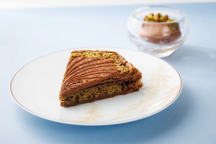 ショコラを使ったサクサクのパイ生地の中には、香ばしいピスタチオとショコラを合わせたアーモンドクリームをたっぷりと。カカオ75%のショコラのアイスクリームとともに提供され、アイスの濃厚なコクが重なることで、よりショコラの華やかな味わいを楽しめる。さらに、フェーブが当たった人にはプレゼントも。年のはじまりの運試しに、ぜひ味わってみて。