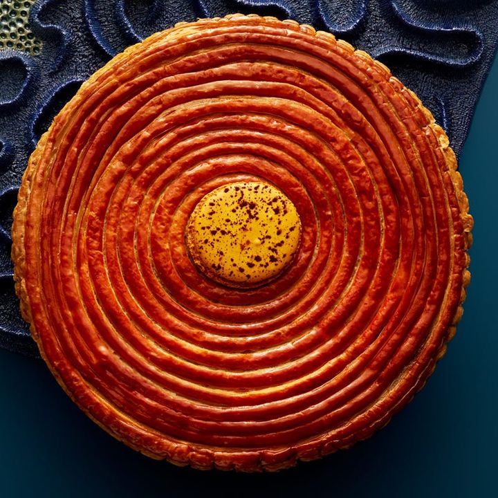 「ピエール・エルメ・パリ 青山」限定で登場するのは、ピエール・エルメ氏が考案した、ブランドを象徴する甘酸っぱいパッションフルーツとミルクチョコレートのフレーバー「モガドール」をアレンジしたガレット・デ・ロワ。渦を描くように施されたレイエと、中央に配されたマカロンコックが目を引く、洗練された美しさの一品だ。