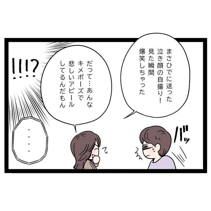 「まさひでに送った泣き顔の自撮り!見た瞬間爆笑しちゃった。だって・・あんなキメポーズで悲しいアピールしてるんだもん」私の言葉に驚くまさひでと、絶句するレイ子の様子が伺えました。