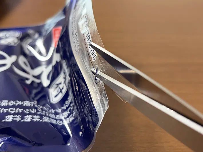 次に、すき間にハサミを食い込ませて、袋の表面だけを切りましょう。