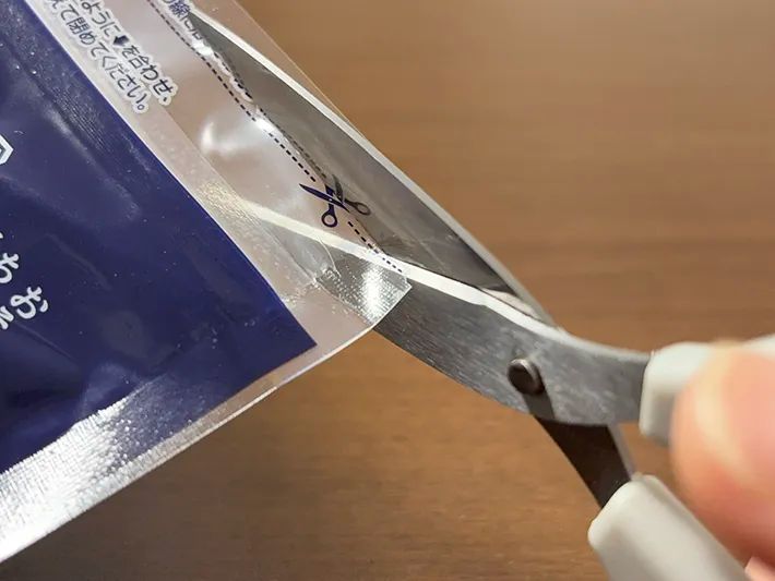 まず、袋の端にハサミで少しだけ切り込みを入れます。