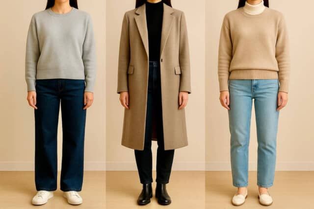冬のニットやスウェットは厚みがある分、丈が少し合わないだけで“寸胴見え”になってしまいます。短すぎると丸みが強調され、長すぎると腰位置が曖昧になってスタイル全体がぼやけて見えることも。
