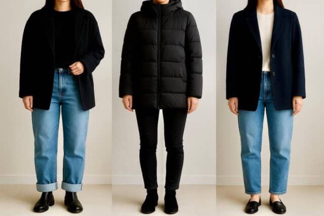 ▲左から、濃色デニムを白スニーカーで軽やかに仕上げたクリーンカジュアル、ロングコートで縦ラインを強調したミニマルな冬スタイル、淡色デニム×ベージュでまとめた柔らかなデニムコーデ