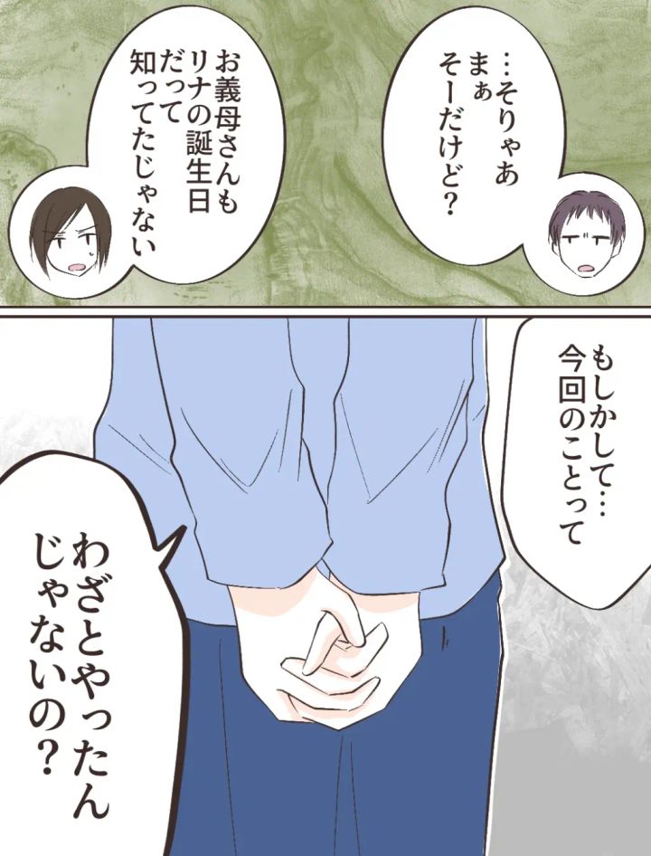 部屋の飾りつけや料理、ケーキまで準備して、家族でリナの誕生日を祝うのを心待ちにしていたのに、タイキはそれを「リナが喜んでたならそれでいいじゃん」の一言で片付けようとします。しまいには、一緒に過ごせなかったのは私が義母に予定を伝えなかったせいで、あくまで義母には非がないと言い張りました。
