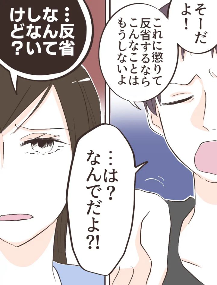 「これに懲りて反省するなら、こんなことはもうしないよ」となぜか上から目線で言ってくるタイキに、私は淡々と「・・・反省なんてしないけど?」と言い捨てました。すると案の定、タイキは「は?なんでだよ!?」とさらに怒り出しました。