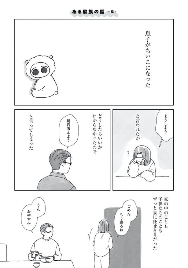 謎の生き物を息子とは思えない。育児を妻に任せてきた夫が気づいた、妻との違い/人類の半数がちいこになった1⑧
