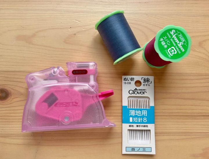 着物リメイクに使用する針は絹糸用でやや長め、番号では四ノ三番くらいがおすすめ。糸は右よりでよじれにくく、なめらかなポリエステル100%の手ぬい専用の糸を使って。針に糸を通せるデスクスレダー(糸通し)も必須。いい道具を使うと作る工程でもストレスがなく、仕上がりもきれいに。