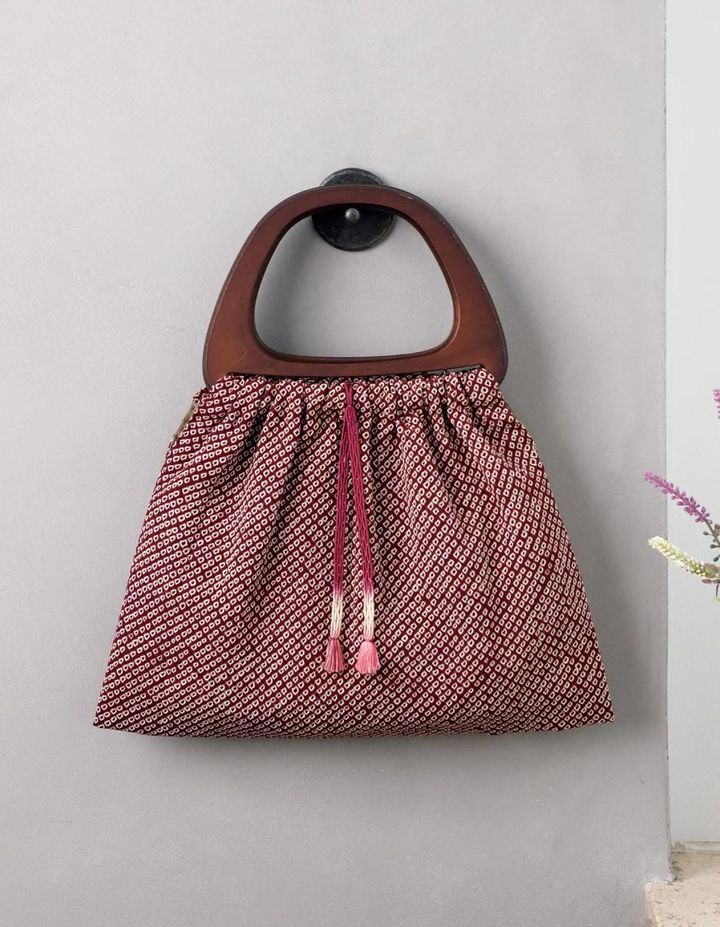 バッグは袖や端切れなどからもでき、短時間で作れるためリメイク初心者にぴったり。羽織のひもを中央に飾りましたが、手持ちの細組みひもやビーズを通したひもなどでも代用できます。