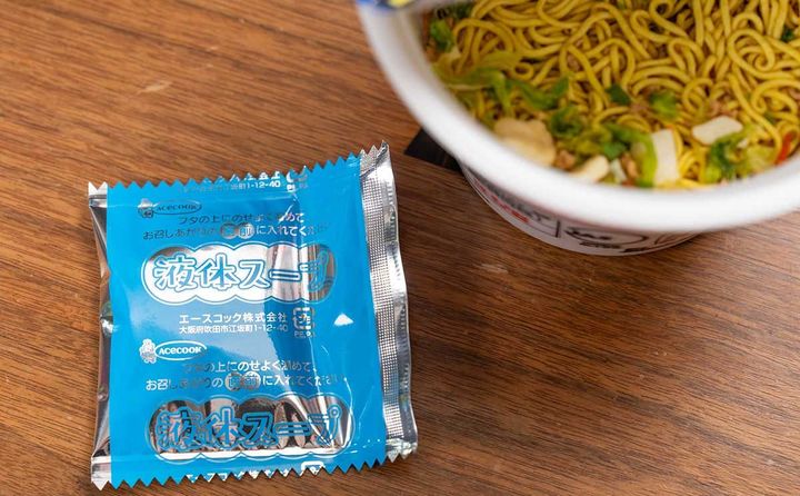 カップの中には、麺と具材と一緒に液体スープの袋が入っています。