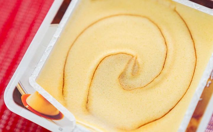 黄色いプリンアイスの中に、茶色いカラメルソースが入っていますね。