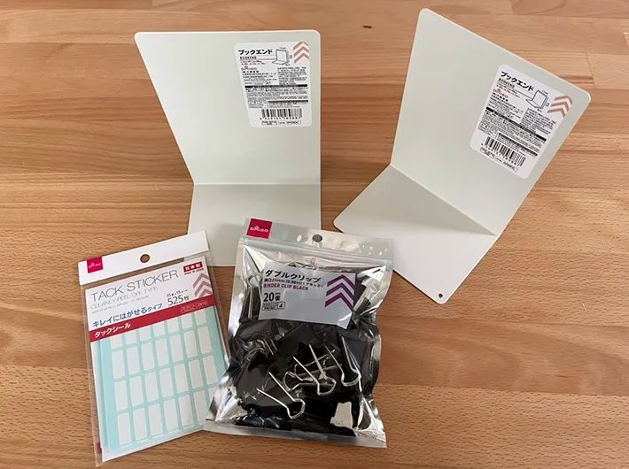 ブックエンドやタックシールも、同じく『ダイソー』で買ったアイテムです。