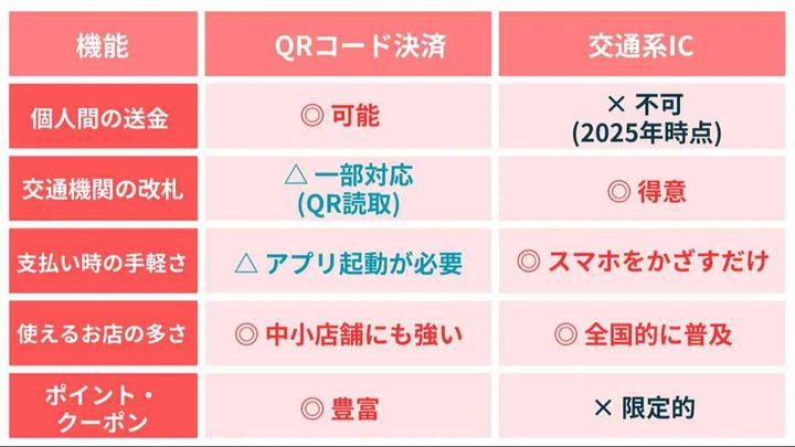 電車やバスを利用する際、QRコード決済は事前にチケット購入やアプリ起動の手間がかかる場合がありますが、交通系IC(Suicaなど)なら改札機にタッチするだけでスムーズに通過できるため、乗り物での利用には交通系ICの方が適しています。一方、QRコード決済はポイント還元や送金機能に強みがあるため、用途に応じて使い分けるのが賢い方法と言えるでしょう。