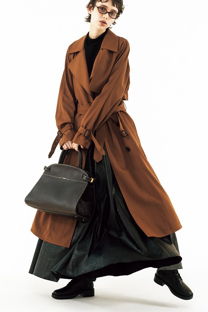 【POINT】普遍的なトレンチを洒脱に見せる、キャメルカラーのエフォートレスなとろみ素材。中からも薄手のレザースカートをなびかせて、すその広がりを強化。