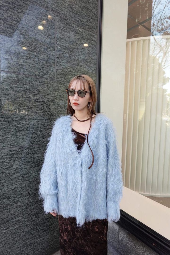 「ブラウンのロンスカは重くなりがちなので、ライトブルーのカーデで軽さを出しました。ふわふわのファーカーデを使って女性らしさも意識。深Vラインのカーデなら、首元に抜け感を出せてバランスが取りやすいんです♪」(MARTE/saharaブランドマネージャー、SYKIA デザイナー三好香織さん)