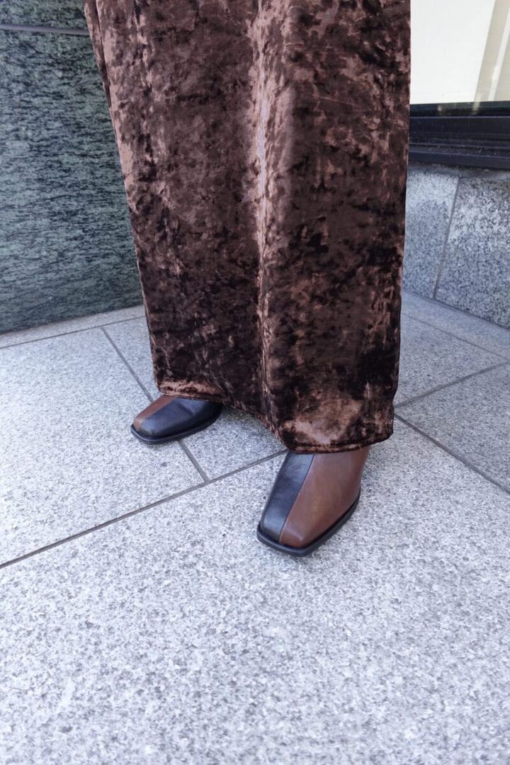 冬気分を満喫できるファーカーデと、光沢感が魅力的なベロアのロングスカートの組み合わせ。ファーカーデのボリューム感を、ペンシルシルエットのスカートですっきりとまとめています。スカートのほか、インナーやシューズもトレンドカラーのブラウンを取り入れたのもポイント。水色×ブラウンの配色も今年らしさをアップデートしています。