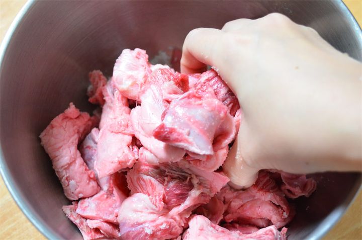 1. 牛すじ肉を3~5cm角に切って、塩20gをもみ込み3時間おく。