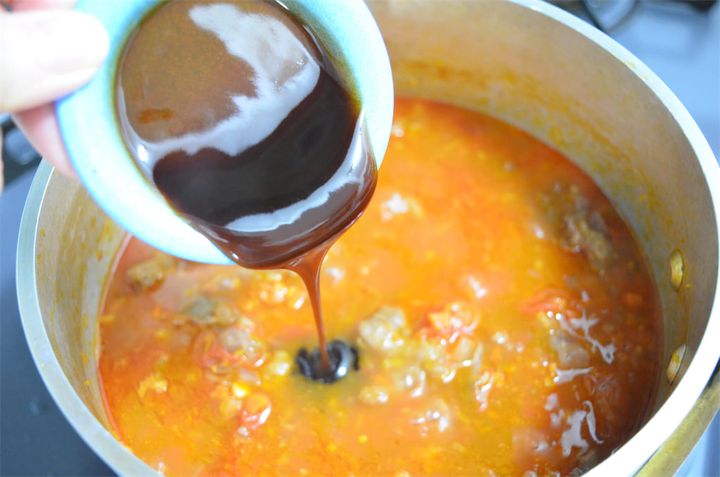 5. 2の牛すじ肉を4の鍋に入れ 、トマト 、赤ワインと白ワイン、コンソメを入れて沸騰したら弱火で20~30分煮込む。