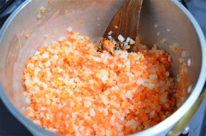 4. 鍋にオリーブオイルを入れ、にんにくを香りが立つまで炒めて、玉ねぎ、にんじんを加え、中火で10分炒める。