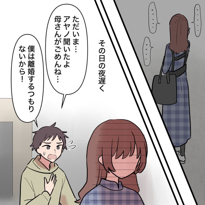 見ると、知らない番号からの着信。私は戸惑いながらも一応電話に出ました。そして、その日の夜遅くトモヤが帰宅しました。申し訳なさそうに「ただいま・・。アヤノ、聞いたよ。母さんがごめんね・・」と謝ってきて「僕は離婚するつもりないから!」と。トモヤの言葉はすべて軽く感じます。謝れば許してもらえると思っているのか、自分が離婚しないと言ったら私が素直に喜ぶと思っているのか。