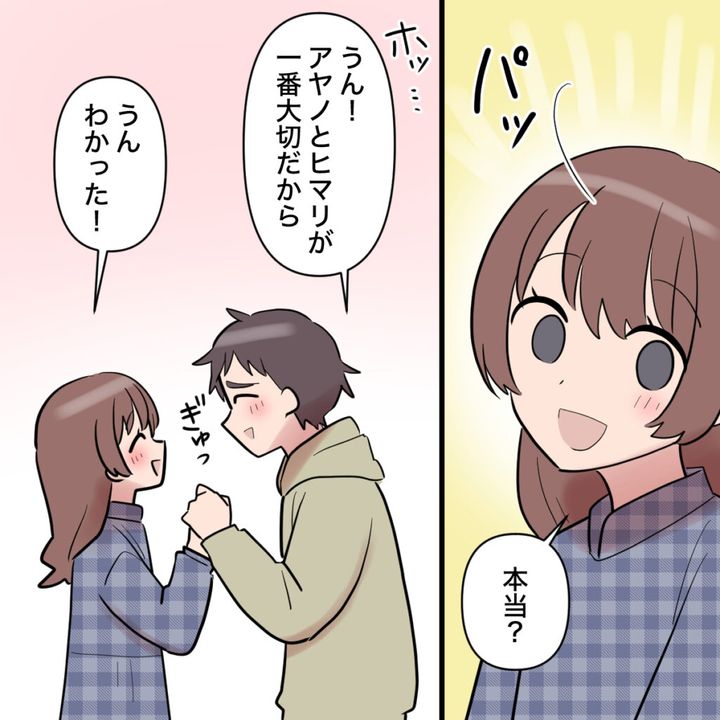 そんな気持ちを抑えて、私は「本当?」とトモヤが求めるような喜んだ姿を見せました。ホッとした様子で「うん!アヤノとヒマリが一番大切だから」といつものお決まりのセリフを口にするトモヤ。この言葉になんの意味もないことはわかっていますが、私は、笑顔で答えました。