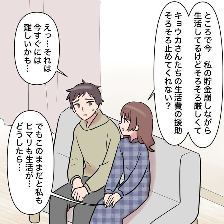 その後、「ところで今、私の貯金を崩しながら生活してるけどそろそろ厳しくて。キョウカさんたちの生活費の援助そろそろ止めてくれない?」と切り出しました。トモヤは「えっ。それは・・今すぐには難しいかも」と予想通りの反応。私は「でもこのままだと私もヒマリも生活が。どうしたら・・」