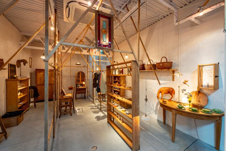 <写真>1階がアンティーク家具のクランク(krank)、2階はこの写真の、雑貨やクランクの藤井健一郎がつくるオブジェが並ぶマルチェロ(marcello)。マルチェロへは、建物の細い階段を上ったり下りたり、屋上に寄ったりしてたどり着くので、初めての方は1階のクランクにて行き方を尋ねてください。